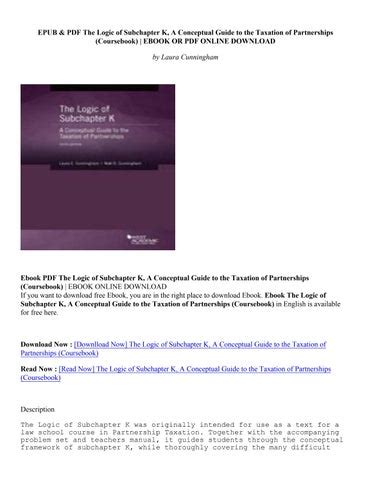 Read Online Logic Subchapter Conceptual Taxation Partnerships Epub online is a convenient and frugal way to read Logic Subchapter Conceptual Taxation Partnerships you love right from the comfort of your own home. Yes, there sites where you can get Epub "for free" but the ones listed below are clean from viruses and completely legal to use.